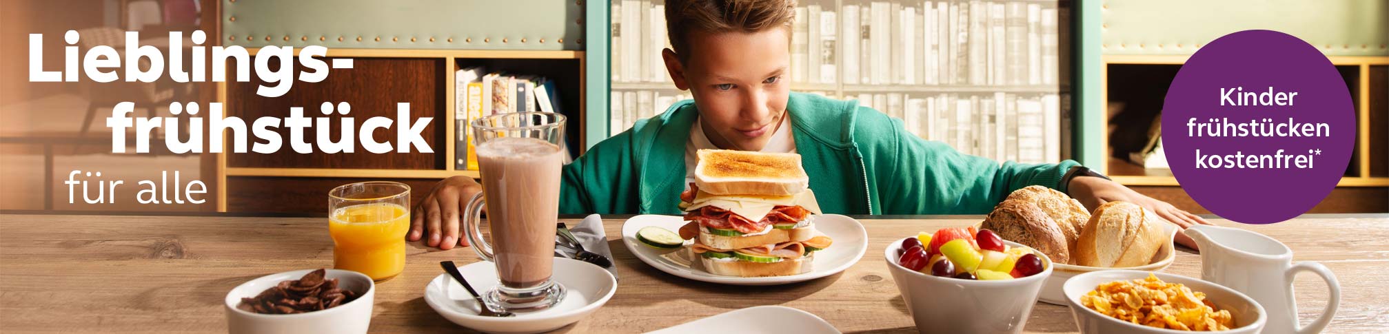 Mit jedem Erwachsenen, der sich zum Frühstück für das abwechslungsreiche All-You-Can-Eat Buffet in unserem Hotel zum Preis von 17,90 €* entscheidet, dürfen jeweils bis zu zwei Kinder unter 16 Jahren kostenlos mitfrühstücken. Essen und trinken Sie so viel Sie wollen. Für jeden Ihrer Liebsten ist garantiert etwas dabei, für das es sich lohnt, Ihr komfortables Zimmer zu verlassen. Machen Sie Ihren Aufenthalt in unserem Hotel mit unserem Frühstück jeden Morgen aufs Neue zu einem echten Rundumgenuss.